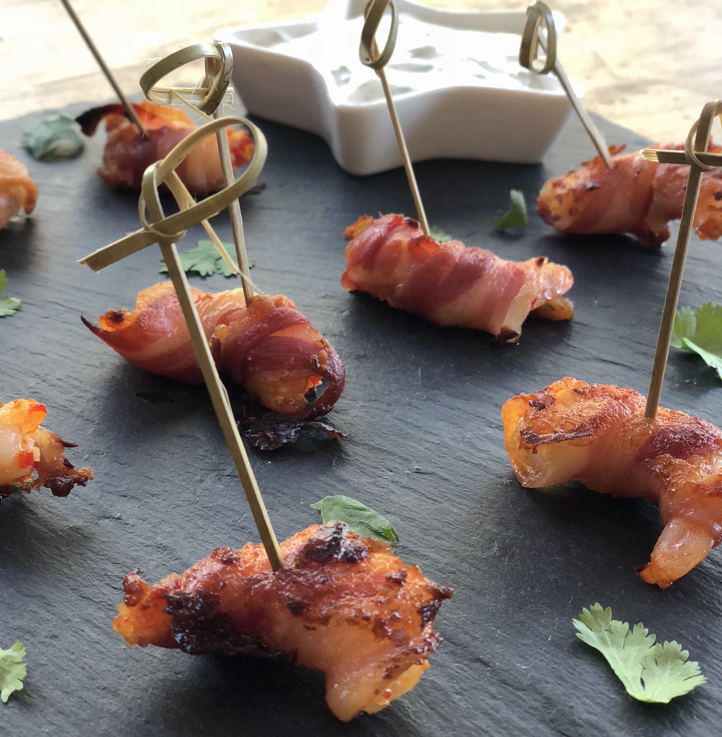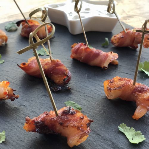 Pancetta wrapped chilli and garlic prawns with a coriander sour cream