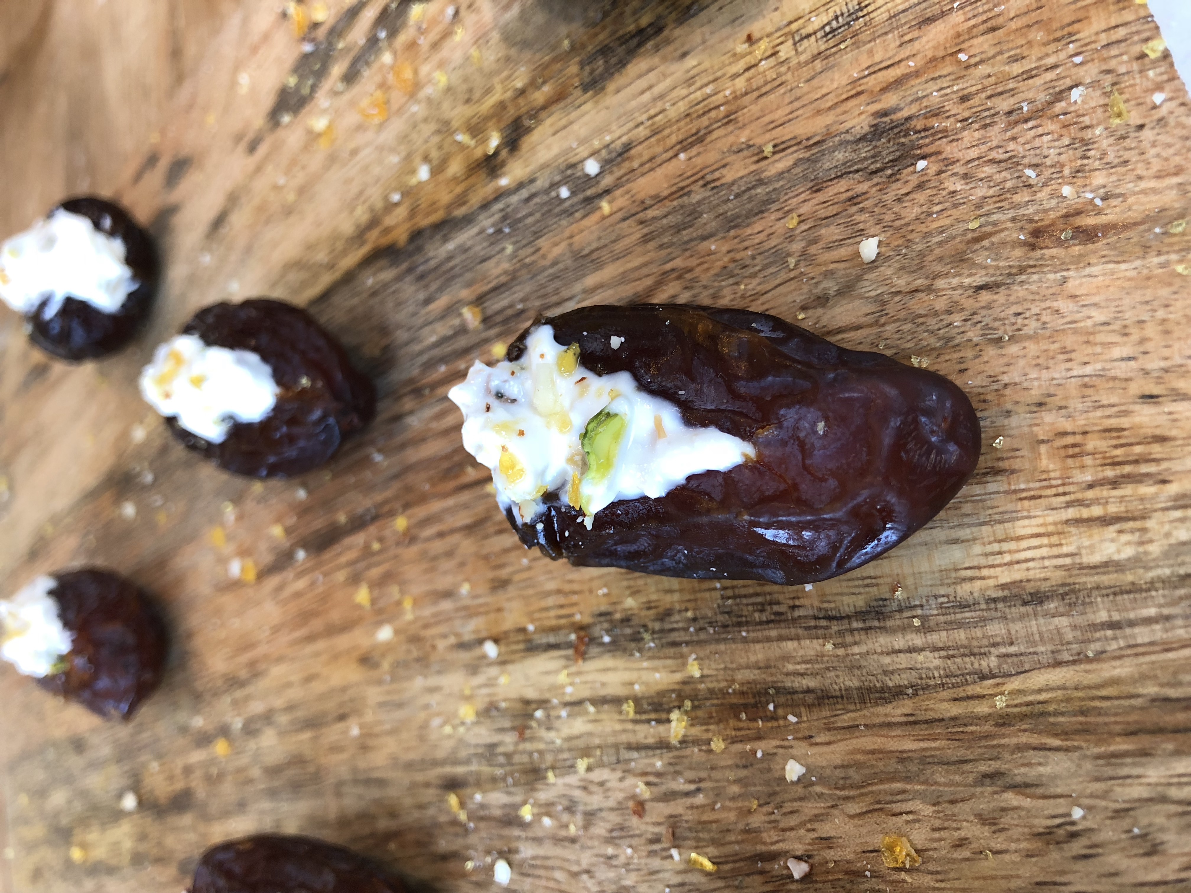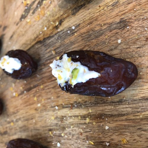 Medjool Dates, goats curd, pistachio and a praline dust