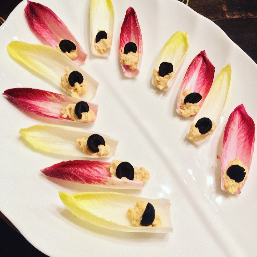 Endive spoons with homemade humous and olives