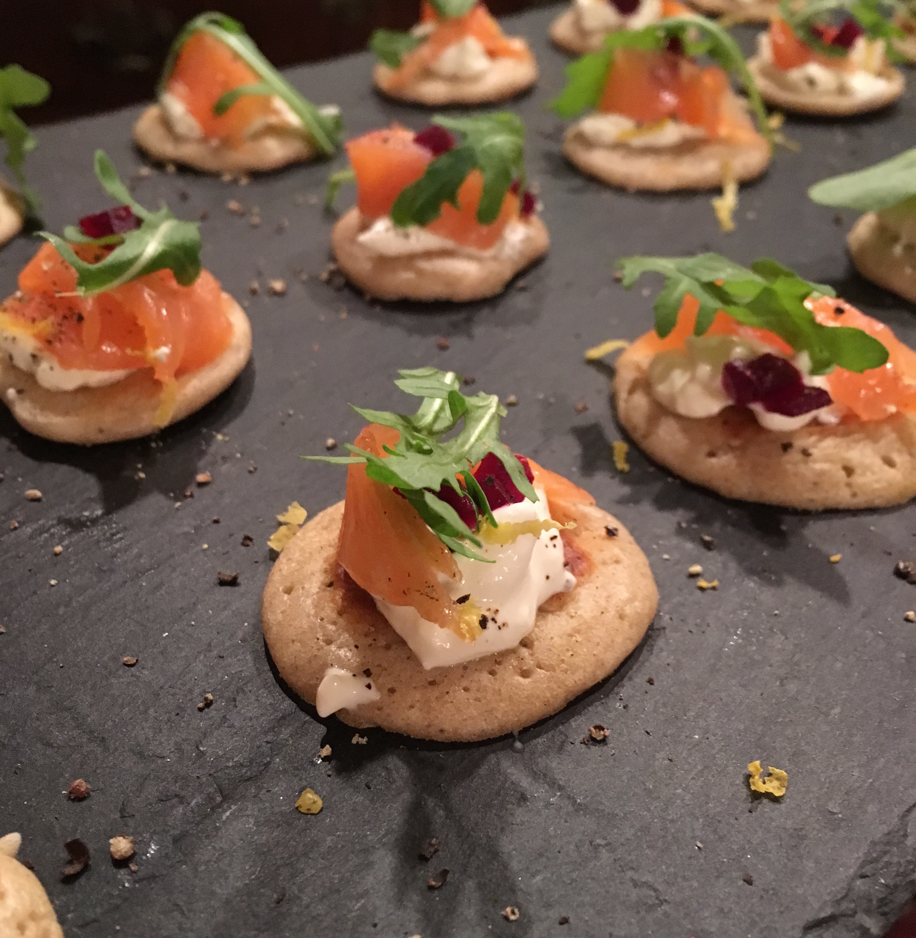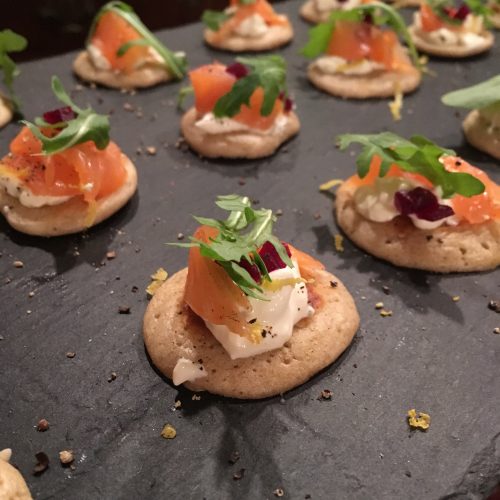 Smoked salmon, horseradish and beetroot, buckwheat blinis
